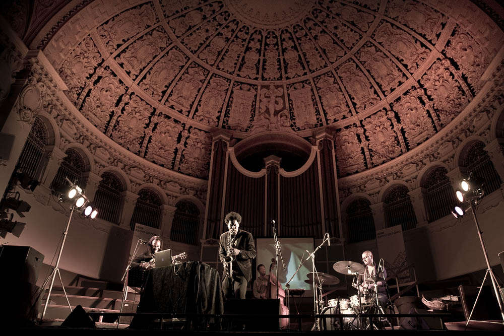 The ornate, cathedral-like space of Oxford Town Hall reverberated to Kinch’s exuberant fusion of jazz, hip-hop and MC rap. His intelligent and humorous introductions quickly established a warm rapport with the audience, and the thoughtful and creative spirit behind the music.