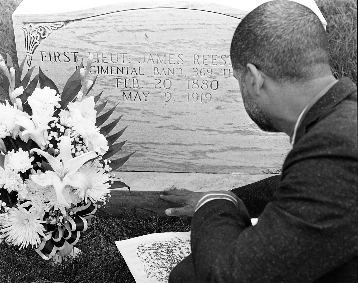 | Jason Moran at the grave of James Reese Europe in Arlington National Cemetery, Virginia Publicity Photo courtesy of 14–18 NOW |