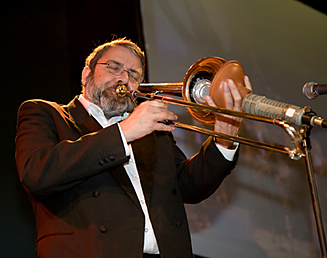 When Bob Hunt, the band’s trombonist and musical director, came out on stage it was to emphasize that band boss Chris Barber would not be appearing as he had formally announced his retirement. So in a nutshell this was the Barber band minus its instigator, guiding force and frontman. Audiences hadn’t always known this, Hunt said. Still, the now 89-year old Barber wanted the band to continue and so it would. At this point on came the rest of the ensemble, lined up and ready to play.