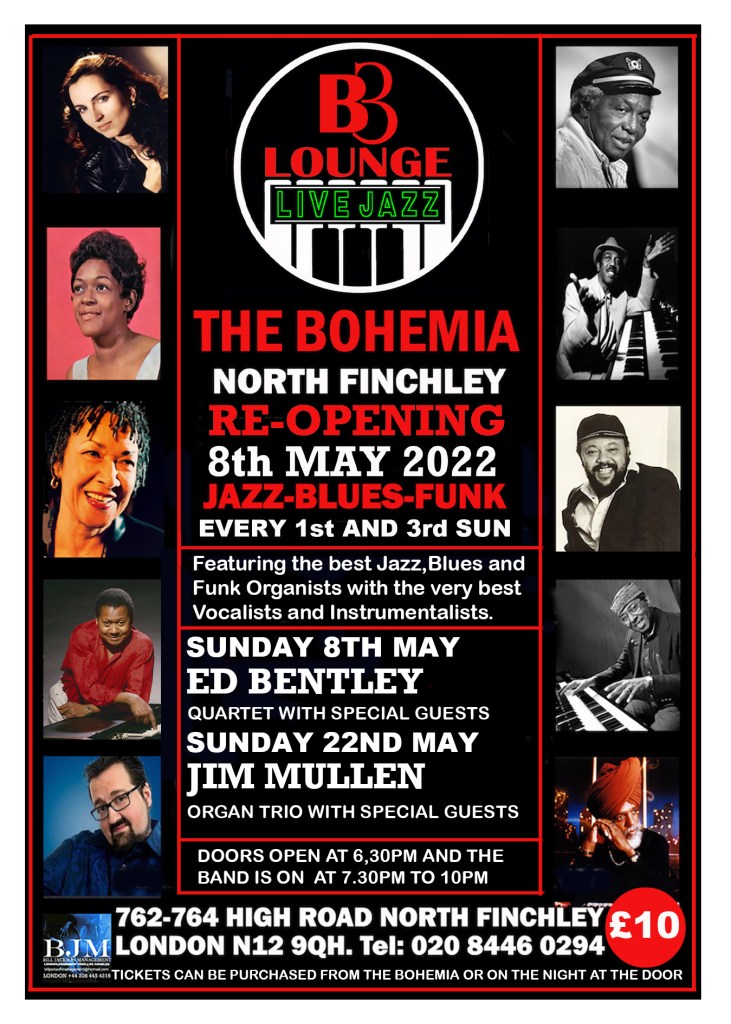 A Hammond-dedicated venue, with its own instrument in place will open at the Bohemia in North Finchley on Sunday 8 May. The gigs will take place on Sundays twice a month, with Ed Bentley the presiding genius behind the venture. His quartet with Jim Mullen on guitar, Dave Lewis on tenor sax and Alun Harries on drums – plus guests – will host the first gig of each month, with guest bands for the second gig of the month. BOOKING LINK BELOW