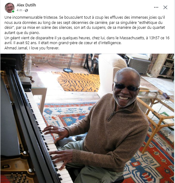 A giant has just passed away a few hours ago, at his home, at 1.57pm on 16 April. He was 92 years old. He was my grandfather in heart and mind. Ahmad Jamal, I love you forever.”